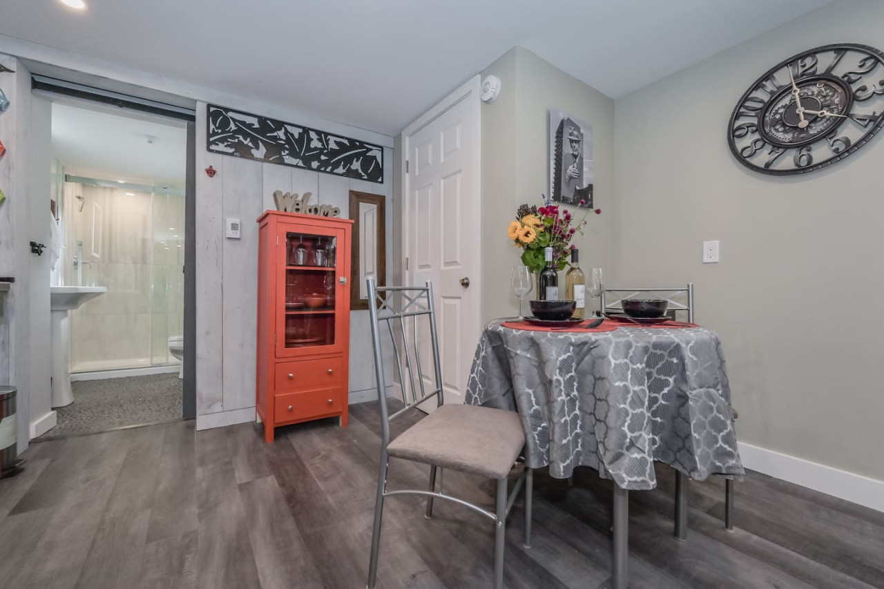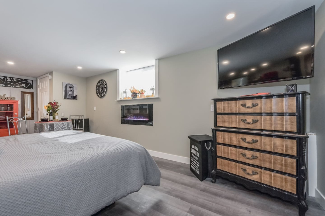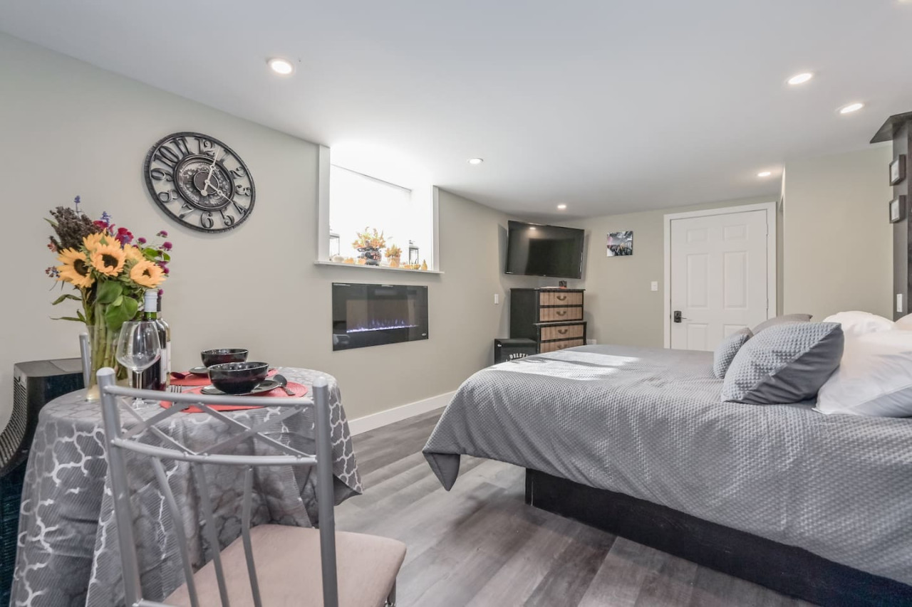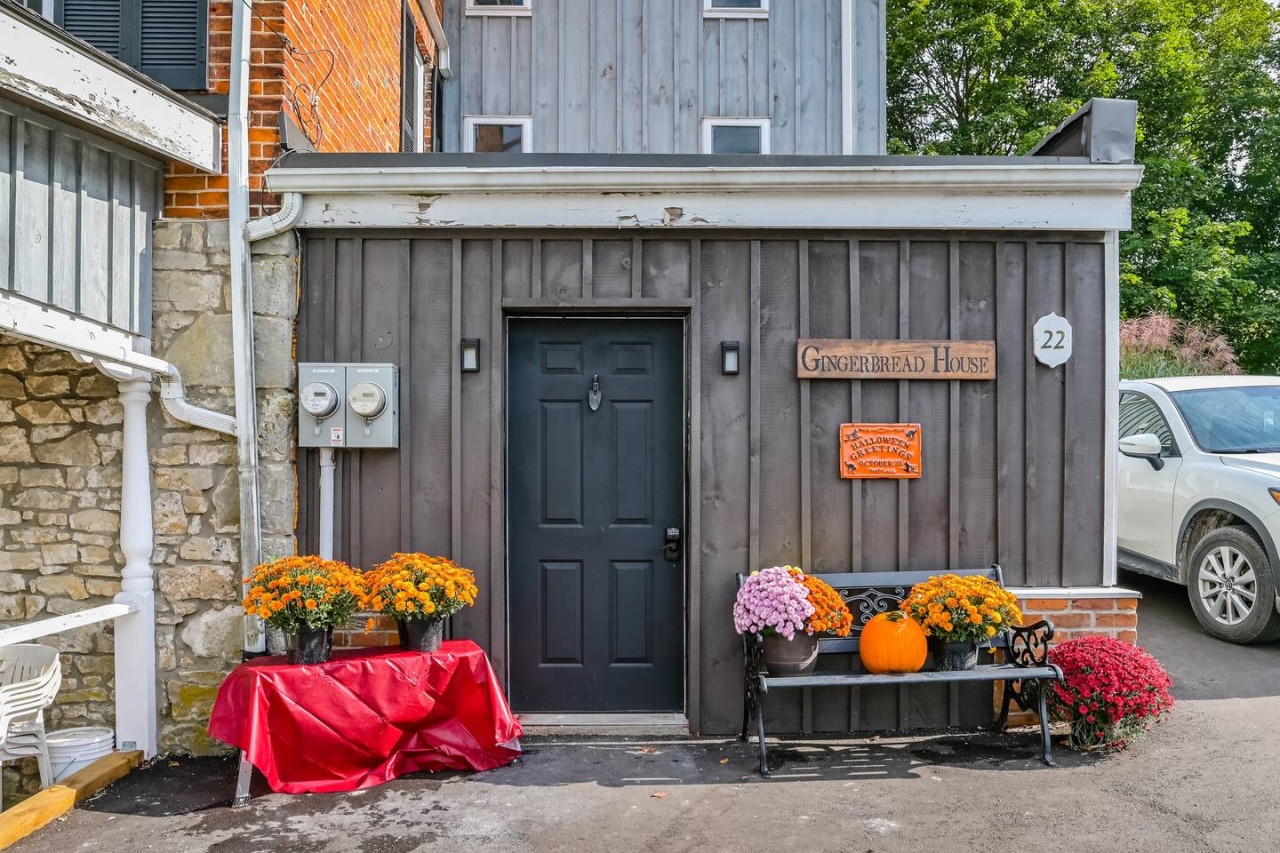 / nightThe Gingerbread House would like you to say hello to its little friend. Welcome to the Gingersnap. It's a one bedroom apartment with zero stairs your own entrance and a 60 second walk to the Mills wedding venues. Upon entering the room you will find yourself in a retro modern oasis. With a king sized bed, inground heat in both the bedroom and the bathroom. Also you will have a retro kitchenette which is somewhat groovy. The bathroom has a large walk-in shower and all the amenities you need. Probably the most important things you will see happens when you step outside. You will be seeing the Elora Mill and all its venues, with a one minute walk you could be in their wedding chapel. After the wedding you step outside and take the new walking bridge crossing the Grand River to the venues holding all the celebrations for the evening. If you are not here for a wedding, no problem. Crossing that bridge sets you on Mill St. and all that Elora has to offer. The entire outside property is yours to access, Walk around the building and you will see deck with a BBQ. for you to use, or relax at one of the bistro tables by the Vedge Café Feel free to call me at any time, I would be honoured to help you have the best stay possible. 2mi Ute walk from the mill Close to biking ang walking trails
