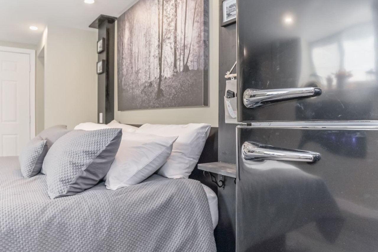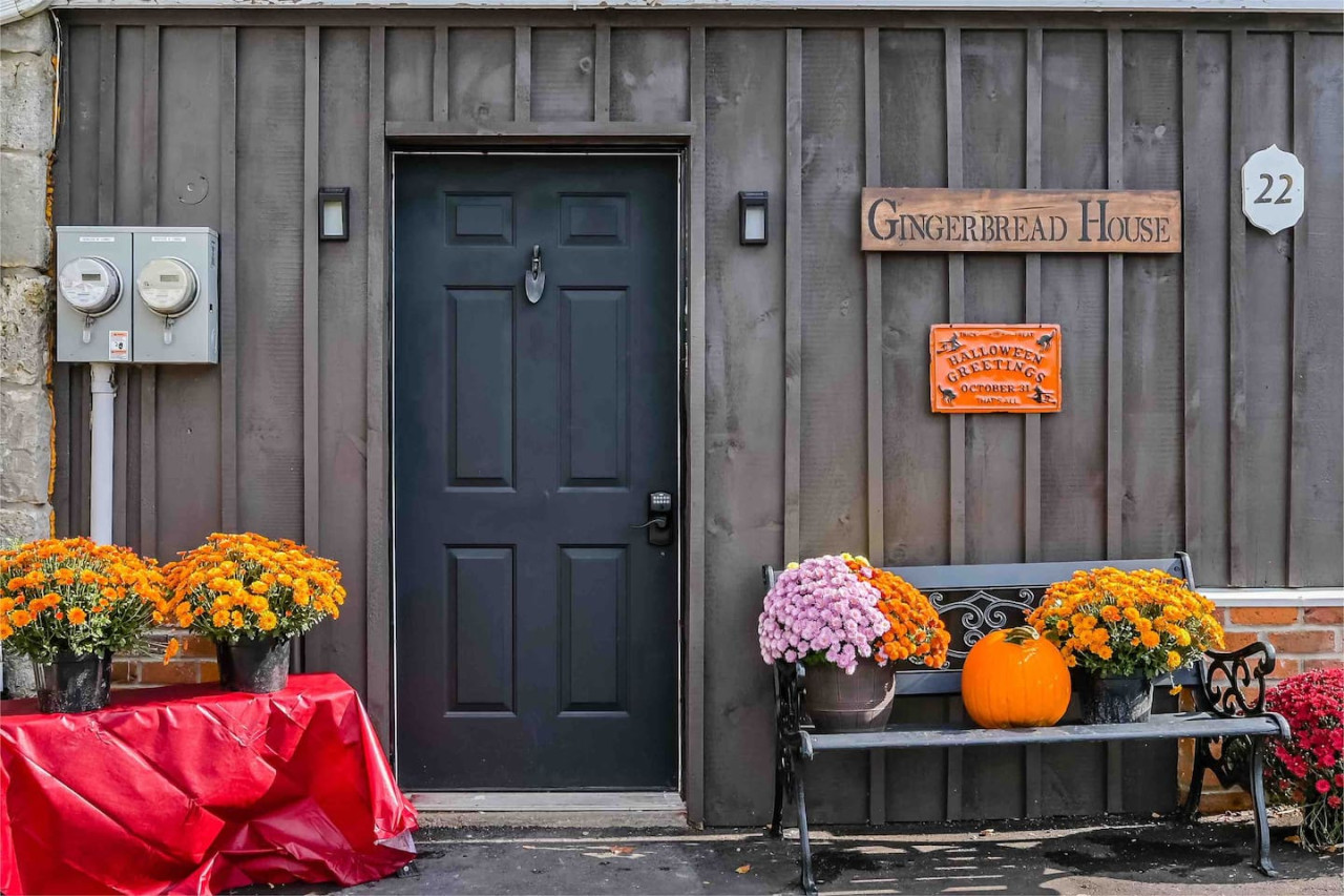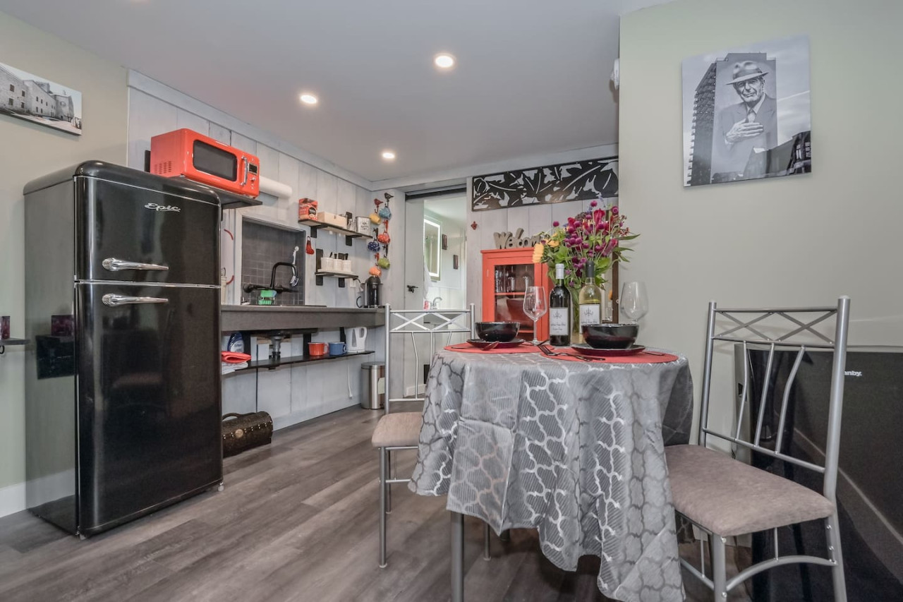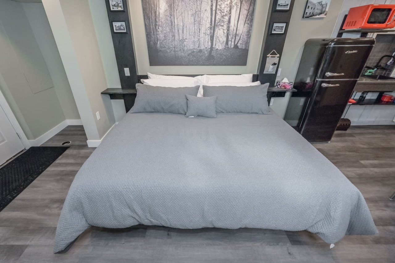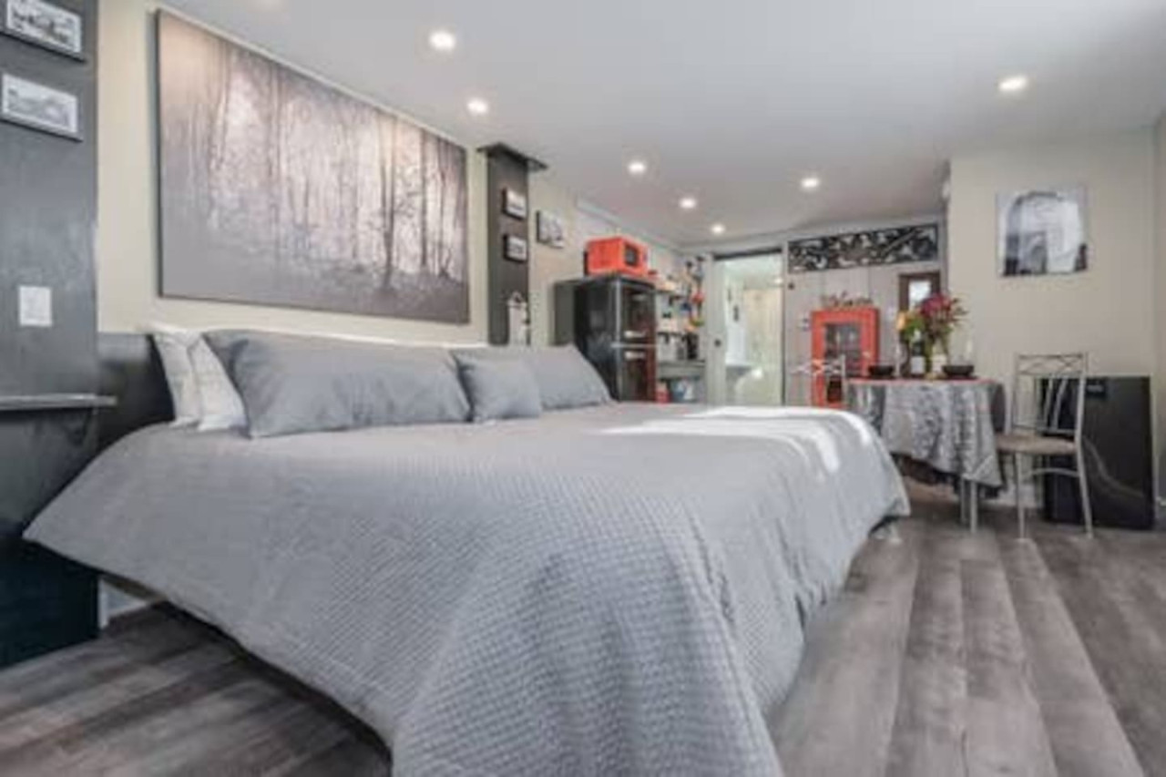 / nightThe Gingerbread House would like you to say hello to its little friend. Welcome to the Gingersnap. It's a one bedroom apartment with zero stairs your own entrance and a 60 second walk to the Mills wedding venues. Upon entering the room you will find yourself in a retro modern oasis. With a king sized bed, inground heat in both the bedroom and the bathroom. Also you will have a retro kitchenette which is somewhat groovy. The bathroom has a large walk-in shower and all the amenities you need. Probably the most important things you will see happens when you step outside. You will be seeing the Elora Mill and all its venues, with a one minute walk you could be in their wedding chapel. After the wedding you step outside and take the new walking bridge crossing the Grand River to the venues holding all the celebrations for the evening. If you are not here for a wedding, no problem. Crossing that bridge sets you on Mill St. and all that Elora has to offer. The entire outside property is yours to access, Walk around the building and you will see deck with a BBQ. for you to use, or relax at one of the bistro tables by the Vedge Café Feel free to call me at any time, I would be honoured to help you have the best stay possible. 2mi Ute walk from the mill Close to biking ang walking trails