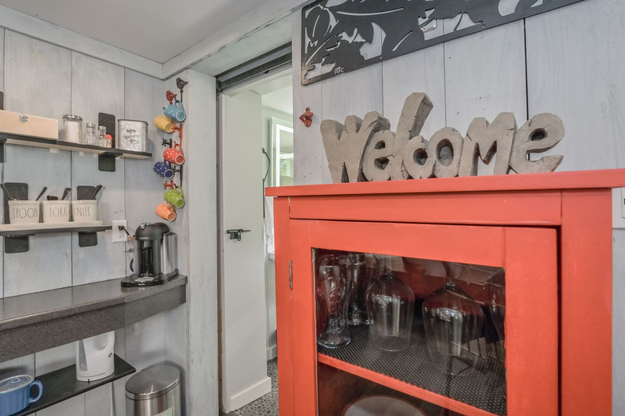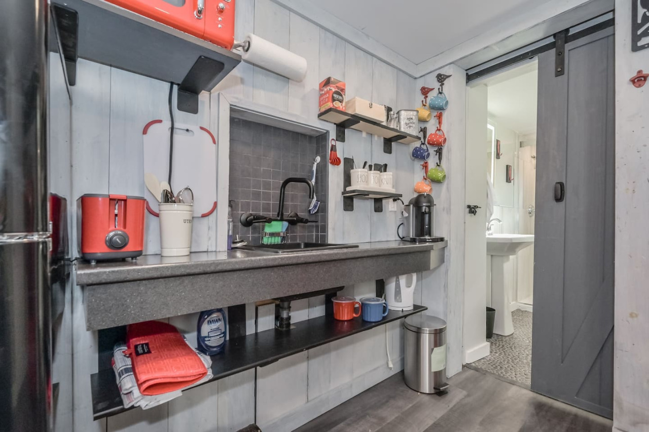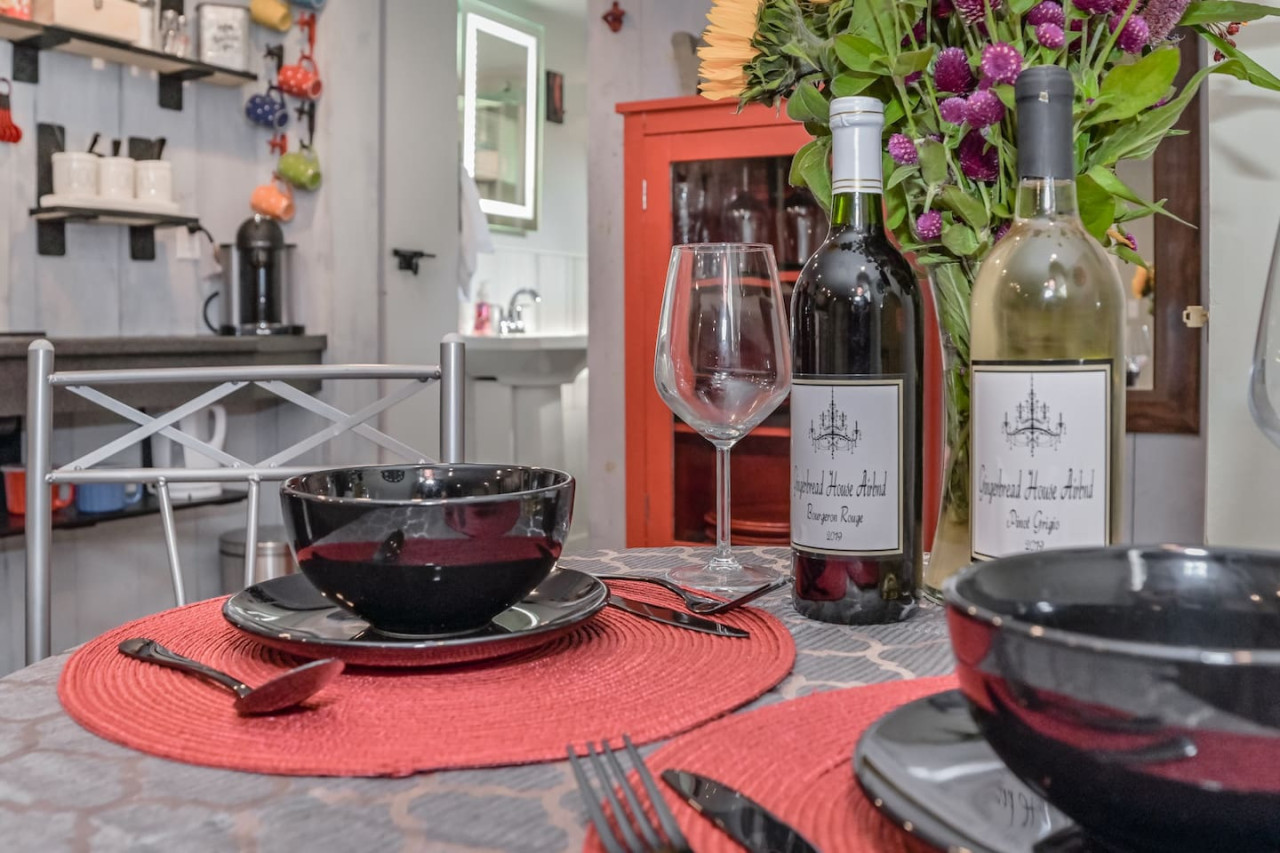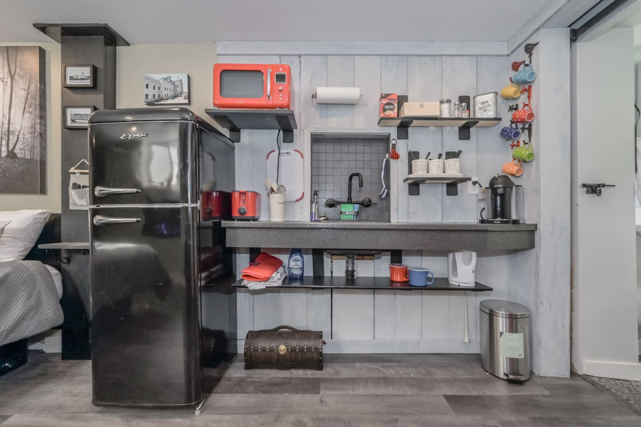 / nightThe Gingerbread House would like you to say hello to its little friend. Welcome to the Gingersnap. It's a one bedroom apartment with zero stairs your own entrance and a 60 second walk to the Mills wedding venues. Upon entering the room you will find yourself in a retro modern oasis. With a king sized bed, inground heat in both the bedroom and the bathroom. Also you will have a retro kitchenette which is somewhat groovy. The bathroom has a large walk-in shower and all the amenities you need. Probably the most important things you will see happens when you step outside. You will be seeing the Elora Mill and all its venues, with a one minute walk you could be in their wedding chapel. After the wedding you step outside and take the new walking bridge crossing the Grand River to the venues holding all the celebrations for the evening. If you are not here for a wedding, no problem. Crossing that bridge sets you on Mill St. and all that Elora has to offer. The entire outside property is yours to access, Walk around the building and you will see deck with a BBQ. for you to use, or relax at one of the bistro tables by the Vedge Café Feel free to call me at any time, I would be honoured to help you have the best stay possible. 2mi Ute walk from the mill Close to biking ang walking trails